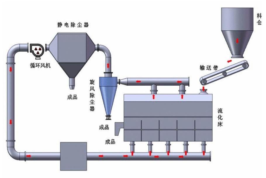 流化床干燥設備是一種高效的干燥設備,適用于無凝聚作用的散粒狀物料的干燥。其工作原理是濕物料進入流化床內與熱空氣接觸,形成流化狀態,使物料顆粒與熱空氣充分混合,進行強烈的傳熱和傳質,從而脫除水分,達到干燥效果。合格的產品由流化床的出料口排出,含塵氣體則經過除塵裝置凈化后排放。